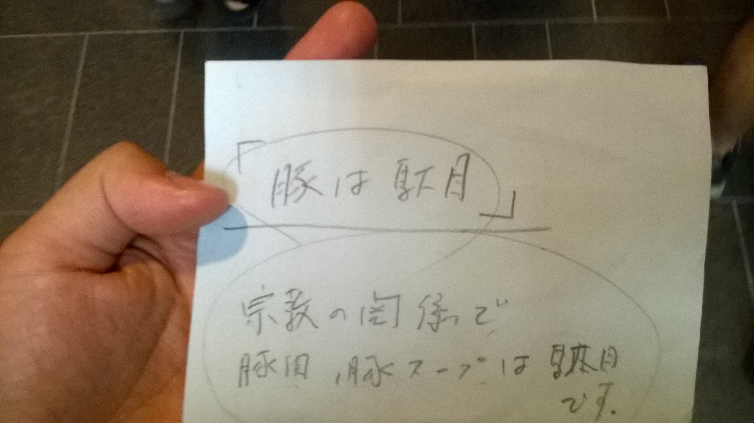 Sewaktu di Nara, Irwan menceritakan mengenai kesulitan kami dalam menemukan makanan halal. Kemudian petugas tourist information centre tersebut membuatkan kami catatan kecil, ditulis dalam bahasa Jepang, katanya sih bunyinya bahwa kami tidak makan pork, sake, maupun hal-hal yang berbau pork dan sake. Catatan itu kami tunjukkan setiap kali memasuki restoran, dan pelayan akan menunjukkan menu-menu mana yang halal dan yang tidak. Kami menyebutnya catatan ajaib.