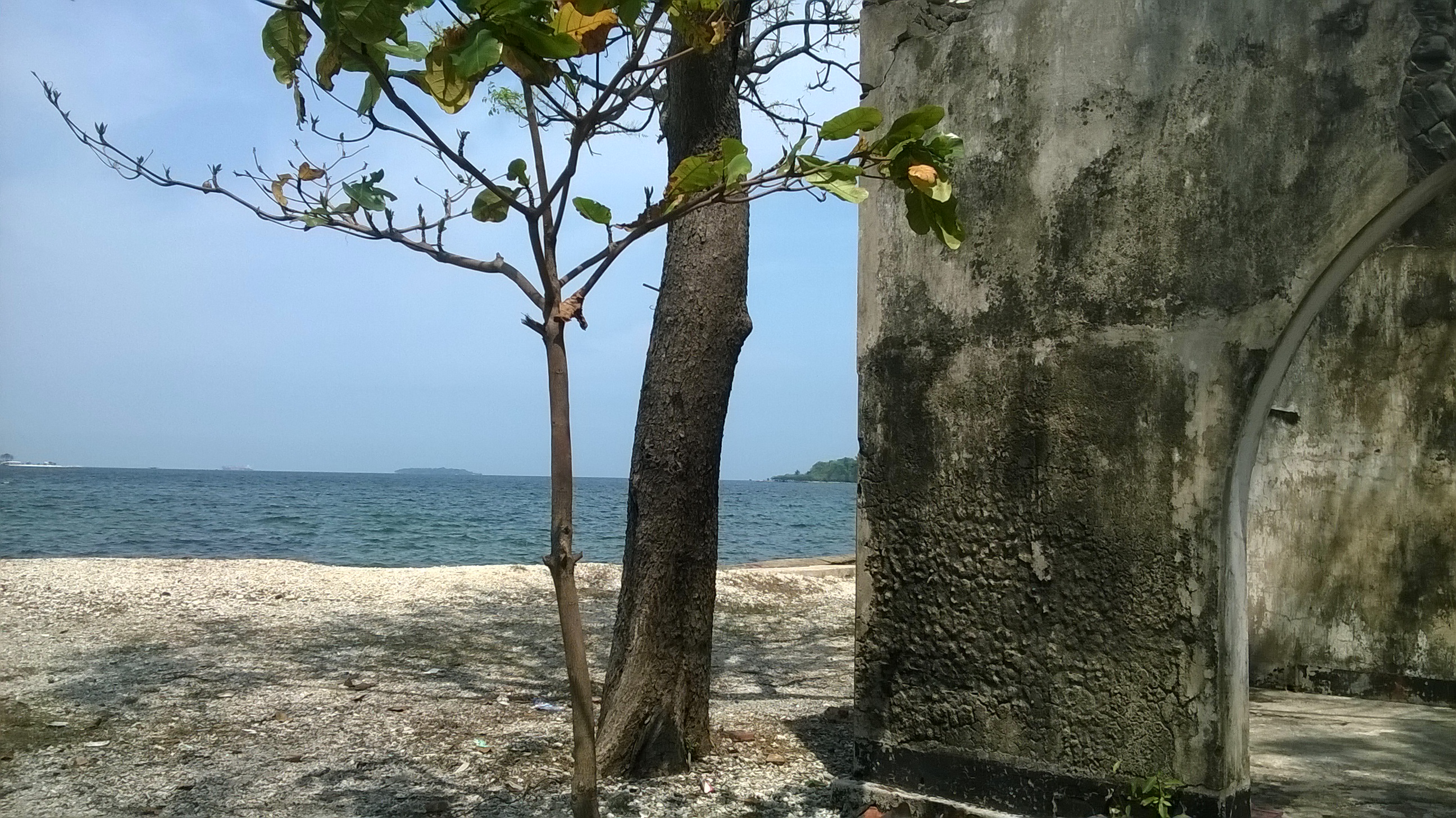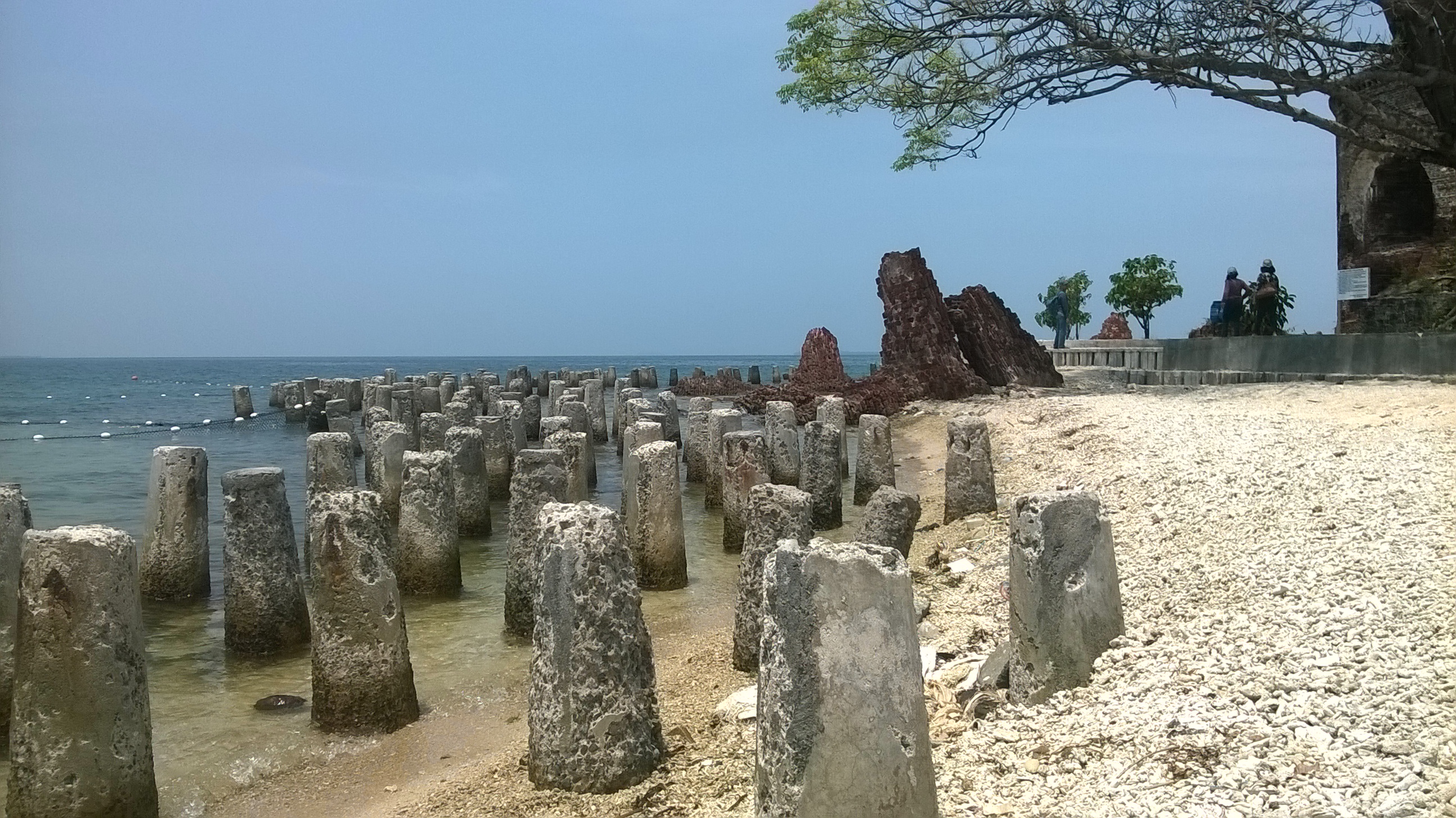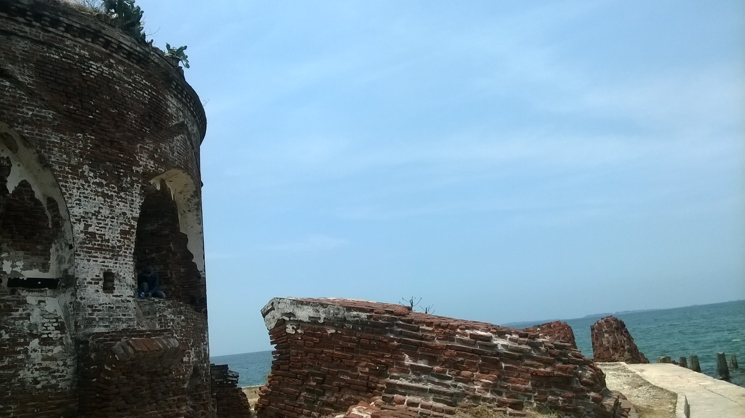 Lapisan luar benteng Martello ini sudah hancur. Katanya sih akibat diserang oleh pasukan Portugis. Selain itu luas Pulau Kelor sepertinya menciut akibat abrasi. Untungnya sudah dipasang pemecah ombak di sekitar pulau ini.