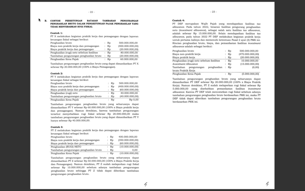 - Wajib Pajak dapat diberikan pengurangan penghasilan bruto paling tinggi 200% (dua ratus persen) dari jumlah biaya yang dikeluarkan untuk kegiatan praktik kerja, pemagangan, dan/ atau pembelajaran.