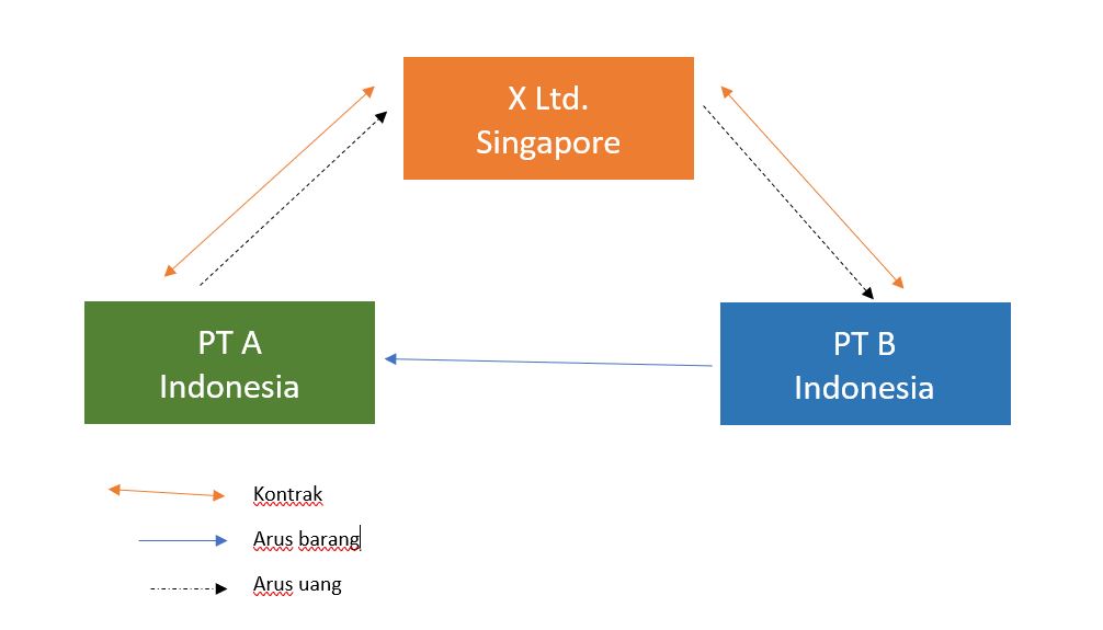 PT B mengirim langsung produk pesanan PT A ke domisili PT A di Jakarta, tanpa dikirim terlebih dahulu ke X Ltd di Singapura. Cara ini dianggap lebih efisien dari sisi biaya dan waktu. PT A membayar pesanannya kepada X Ltd. Antara PT A, PT B dan X Ltd tidak terdapat hubungan istimewa.